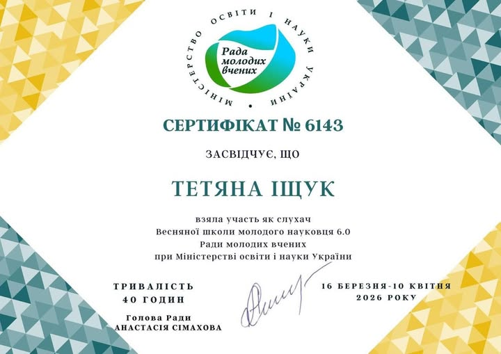 - Участь у весняній школі молодого науковця 6.0 асистента кафедри хімії та хімічної інженерії