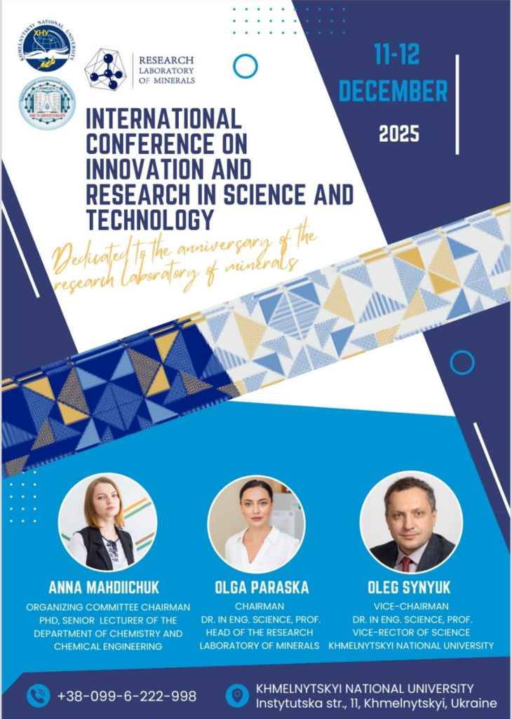 В 2025 році відзначаємо перший ювілей Лабораторії досліджень мінералів. З приємністю анонсуємо проведення міжнародної конференції «INNOVATION AND RESEARCH IN SCIENCE AND TECHNOLOGY» 11-12 грудня 2025 року на кафедрі хімії та хімічної інженерії @chemical_technology_kaf в Хмельницькому національному університеті @khmnu_km.