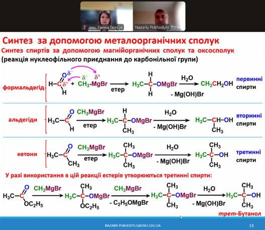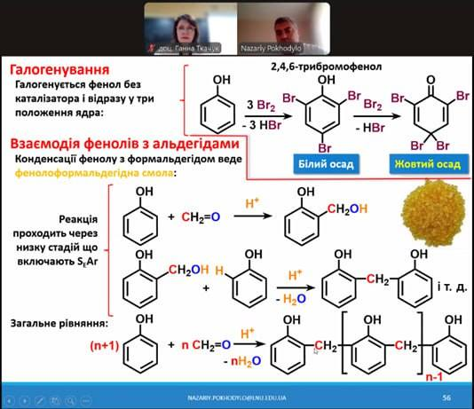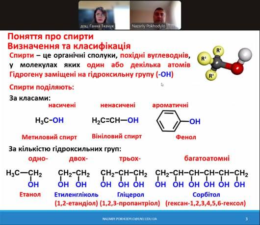 Тема сьогоднішньої лекції “Спирти, феноли, альдегіди, кетони”. Назарій Тарасович ґрунтовно, доступно і цікаво розповів про ці класи органічних сполук, їхню класифікацію, будову, ізомерію, промислові та препаративні методи добування, а також про фізичні та хімічні властивості гідроксильних та карбонільних сполук, пояснив механізми основних реакцій, розказав про застосування основних представників цих речовин в хімічних технологіях.