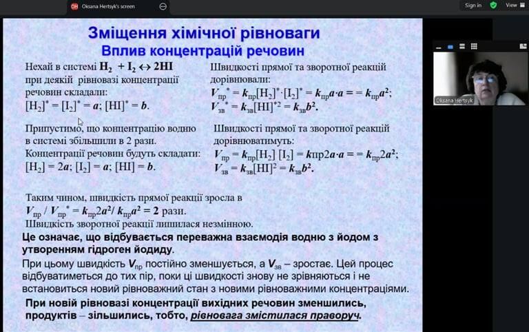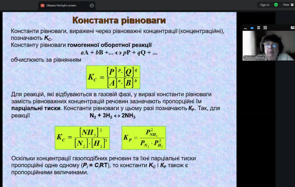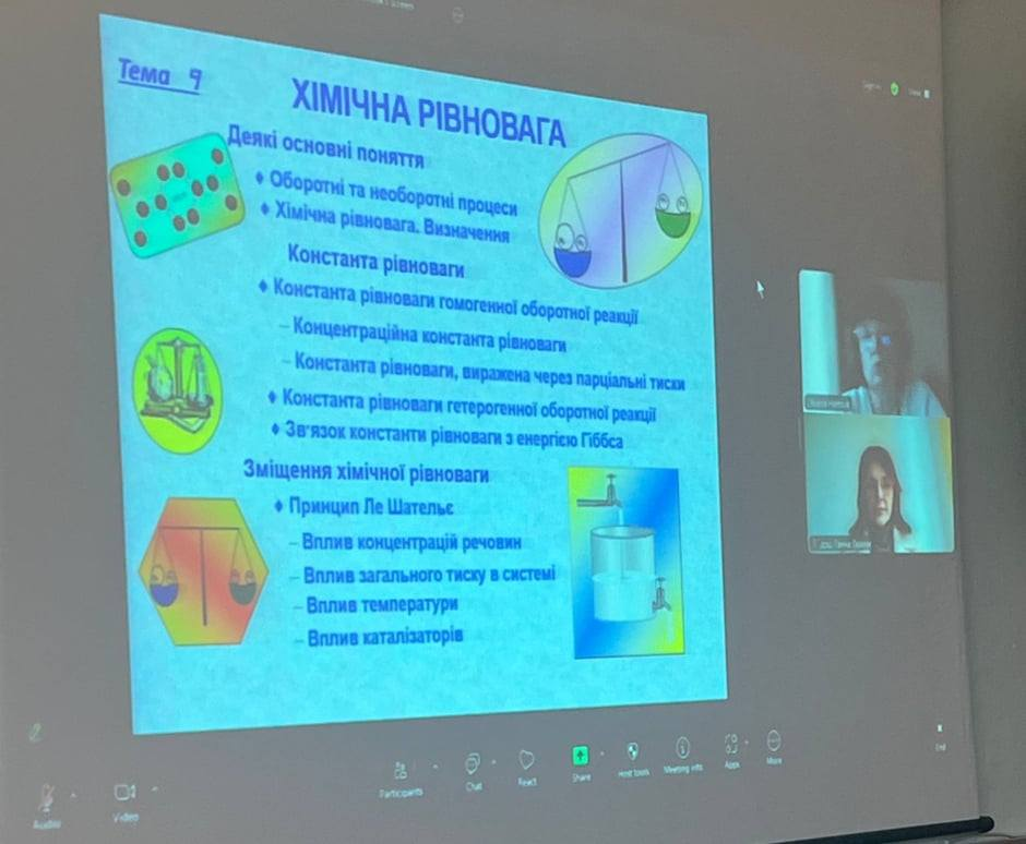 У лекції були розглянуті основні поняття рівноваги хімічних реакцій різних типів, вплив зовнішніх чинників на зміщення хімічної рівноваги. Оксана Миронівна наголосила, що саме фізична хімія, зокрема, хімічна кінетика та рівновага дають апарат для розрахунків хіміко-технологічних процесів. Наприкінці заняття відбувся інтерактив: Оксана Миронівна запропонувала слухачам давати відповіді на питання і розв’язувати ситуативні задачі.