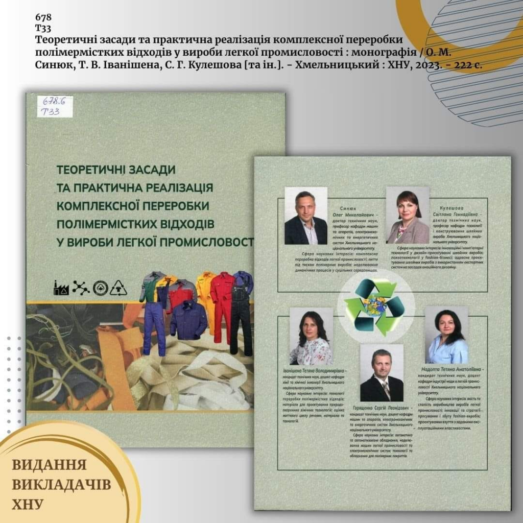 На початку березня 2024 року побачила світ монографія “Теоретичні засади та практична реалізація комплексної переробки полімермістких відходів у вироби легкої промисловості”. Серед колективу авторів кандидат технічних наук, доцент, декан факультету технологій і дизайну Тетяна Іванішена.