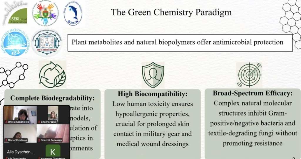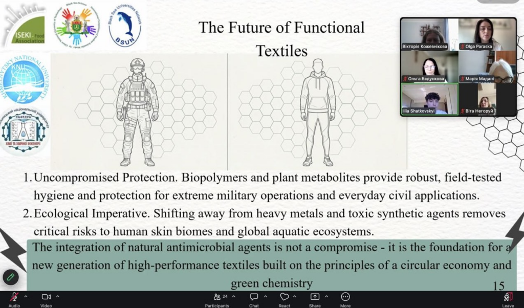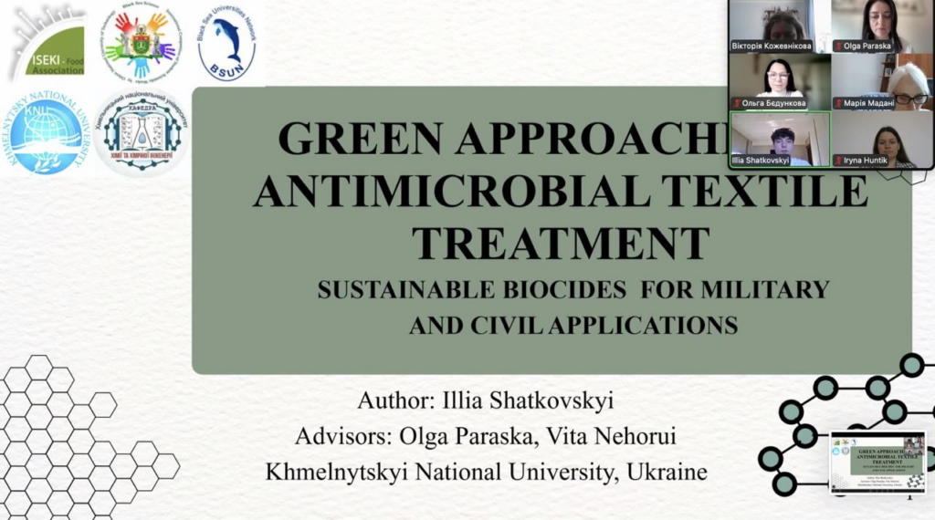 За кожним напрямком були визначені фіналісти робіт згідно з рейтингом, які запрошені до участі у другому етапі конкурсу. Серед фіналістів напряму екологія та охорона навколишнього середовища була наукова робота студента групи ХТІ-25-1 кафедри хімії та хімічної інженерії Іллі Шатковського під керівництвом професора Ольги Параски та викладача Віти Негоруй на тему: «Екологічні (зелені) підходи до антимікробної обробки текстилю військового та цивільного застосування» (Green approaches to antimicrobial treatment of textiles for military and civil applications). У дослідженні наукової роботи розглянуто перспективи використання природних антимікробних агентів у технологіях, спрямованих на надання функціональних властивостей текстильним матеріалам військового та цивільного застосування. Визначено та систематизовано основні класи біологічно активних сполук рослинного походження, що проявляють виражену бактерицидну та фунгіцидну активність. Виділено переваги природних антимікробних агентів у технологіях опорядження текстилю, включаючи біорозкладність, низьку токсичність, екологічну безпеку та широкий спектр антимікробної дії, що відповідає вимогам зеленої хімії та сталого розвитку.