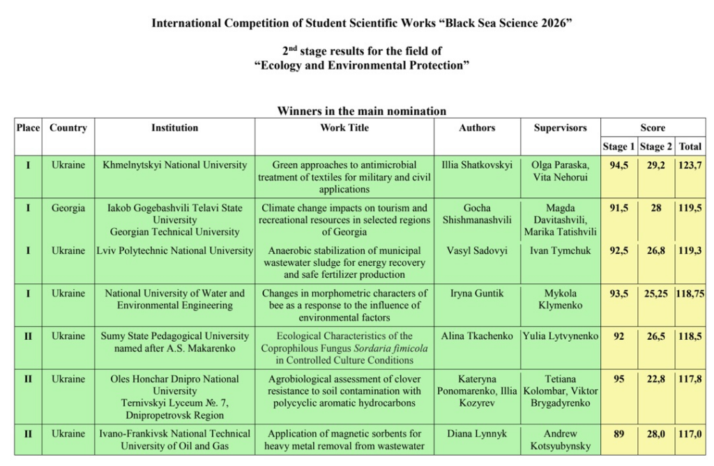 За результатами презентацій та доповідей учасників, журі визначало переможців і розподіл призових місць. Пишаємося досягненнями студентів кафедри хімії та хімічної інженерії та вітаємо студента групи ХТІ-25-1 Іллю Шатковського та його наукових керівників Ольгу Параску та Віту Негоруй з перемогою за напрямом екологія та охорона навколишнього середовища. Всі учасники та наукові керівники будуть нагороджені сертифікатами, а роботи переможців опубліковані в збірнику робіт міжнародного конкурсу студентських наукових робіт «Black Sea Science».