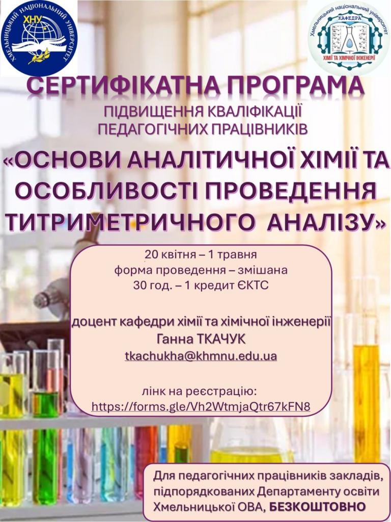 🧪Кафедра хімії та хімічної інженерії запрошує колег педагогічних працівників взяти участь в сертифікатній програмі “ОСНОВИ АНАЛІТИЧНОЇ ХІМІЇ ТА ОСОБЛИВОСТІ ПРОВЕДЕННЯ ТИТРИМЕТРИЧНОГО АНАЛІЗУ” з 20 квітня по 1 травня у змішаному форматі.